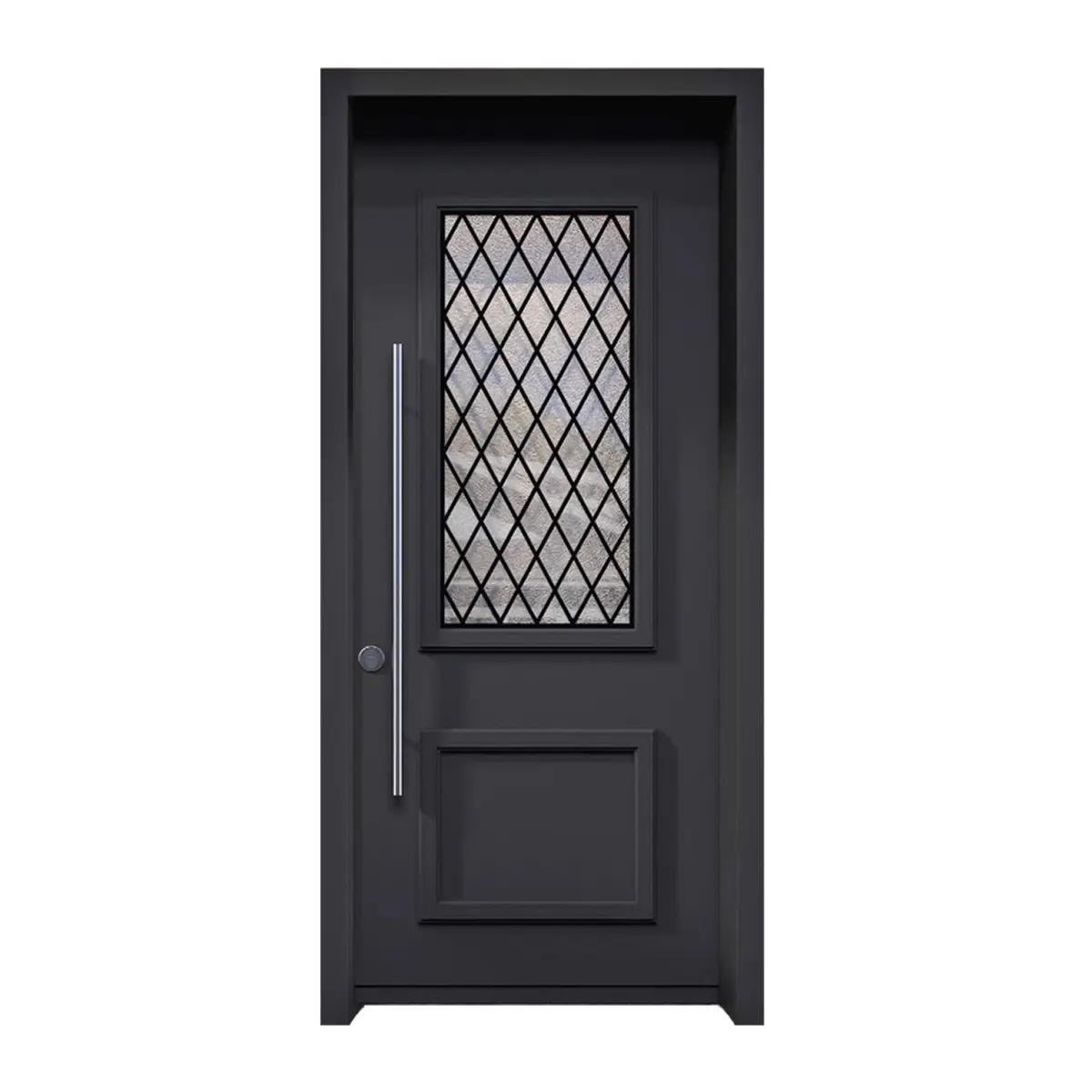 דלת כניסה דגם 3001 מסדרת חלונות בעיצוב קלאסי עם חלון מרכזי בדוגמת יהלומים מודגשת. שילוב של גימור כהה, אור טבעי ונוכחות יוקרתית לכניסה חזקה ומרשימה.