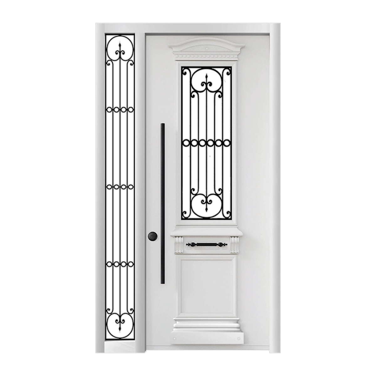 דלת כניסה עם יחידת צד בעיצוב קלאסי יוקרתי בשילוב נפחות אומנותית ופרטים דקורטיביים עשירים. מראה מרשים, אלגנטיות על-זמנית ובטיחות גבוהה לכניסה רחבה ובעלת נוכחות חזקה.