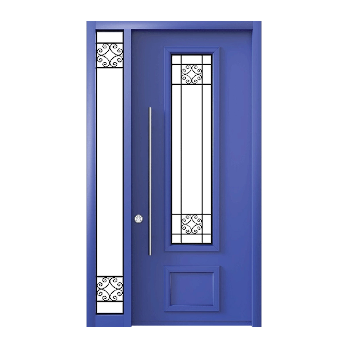דלת כניסה עם יחידת צד מעוצבת בשילוב זכוכית דקורטיבית ונפחות עדינה למראה יוקרתי ומרשים. שילוב של תאורה טבעית, אלגנטיות ובטיחות גבוהה לכניסה רחבה ובעלת נוכחות.