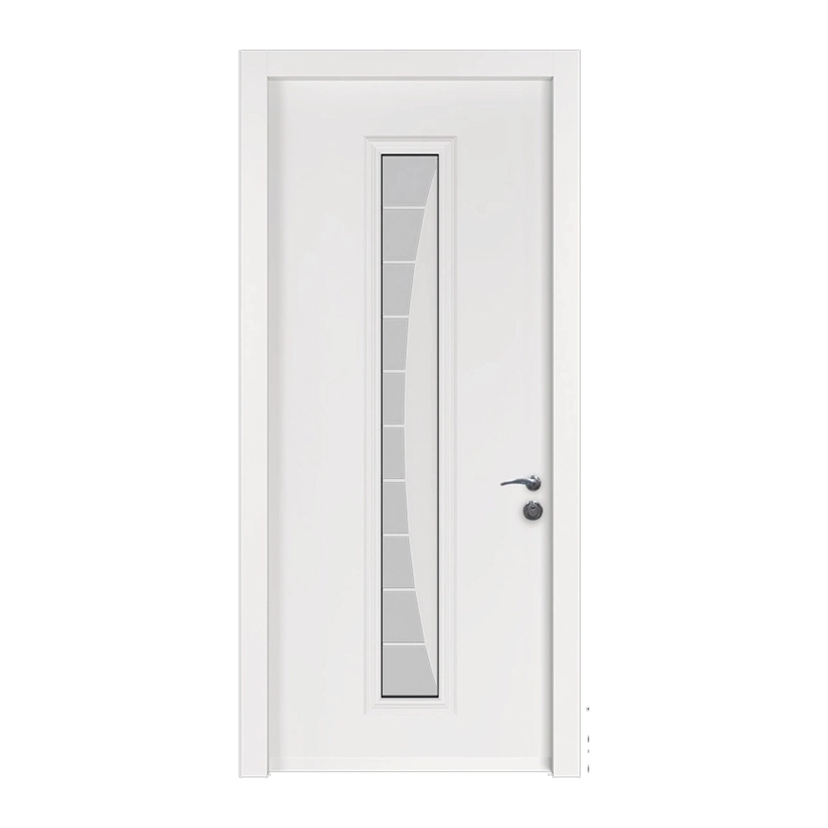 דלת כניסה דגם 7006 מסדרת מרקורי עם חלון זכוכית בעיצוב זורם ודינמי למראה מודרני וייחודי. קווים רכים, עיצוב נקי ובטיחות גבוהה לכניסה בעלת אופי ונוכחות.