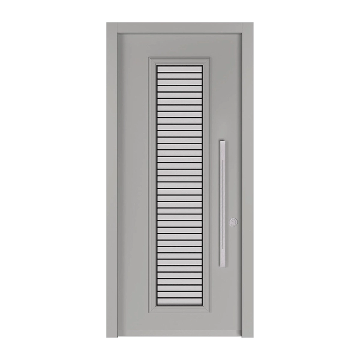 דלת כניסה דגם 7014 מסדרת מרקורי עם חלון זכוכית בחלוקה צפופה ואחידה למראה מודרני מדויק. עיצוב נקי, קווים ישרים ובטיחות גבוהה לכניסה מרשימה ומינימליסטית.