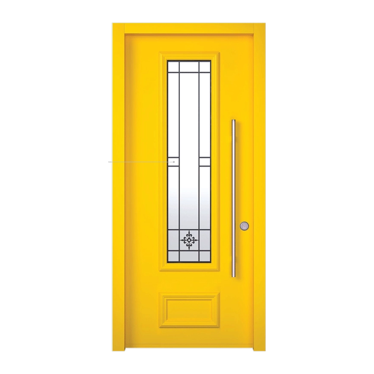 דלת כניסה דגם 8010 בעיצוב קלאסי עם חלון זכוכית דקורטיבי ואלמנטים מנפחות. הדלת משלבת עמידות גבוהה, בטיחות ומראה אלגנטי לבתים פרטיים.