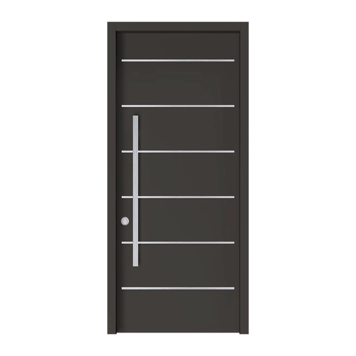 דלת כניסה דגם 2017 בעיצוב מודרני עם קווים אופקיים מודגשים ואלמנט אנכי. הדלת משלבת עמידות גבוהה, בטיחות ומראה יוקרתי לבתים פרטיים.
