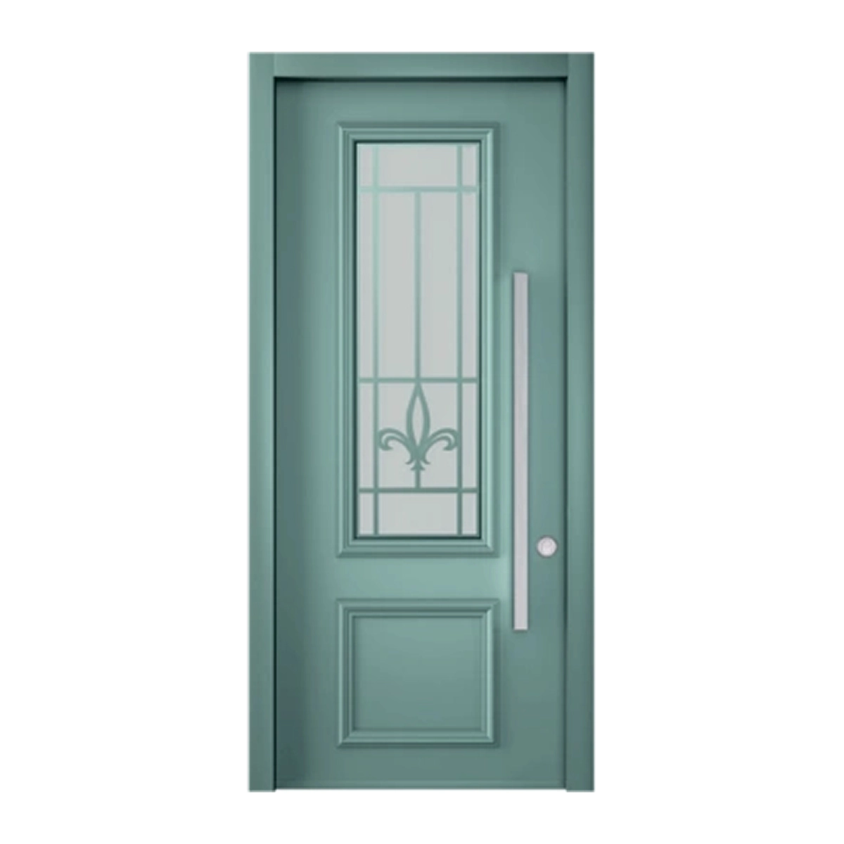 דלת כניסה דגם 5005 בעיצוב קלאסי עם חלון פנורמי דקורטיבי ואלמנטים עדינים. הדלת משלבת עמידות גבוהה, בטיחות ומראה אלגנטי לבתים פרטיים.