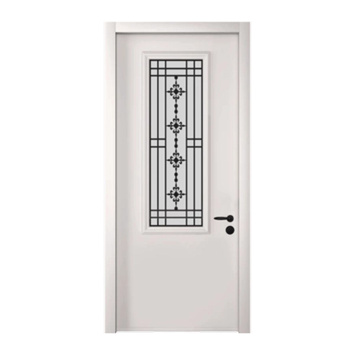 דלת כניסה דגם 5013 בעיצוב קלאסי עם חלון פנורמי דקורטיבי ואלמנטים מברזל. הדלת משלבת עמידות גבוהה, בטיחות ומראה אלגנטי לבתים פרטיים.