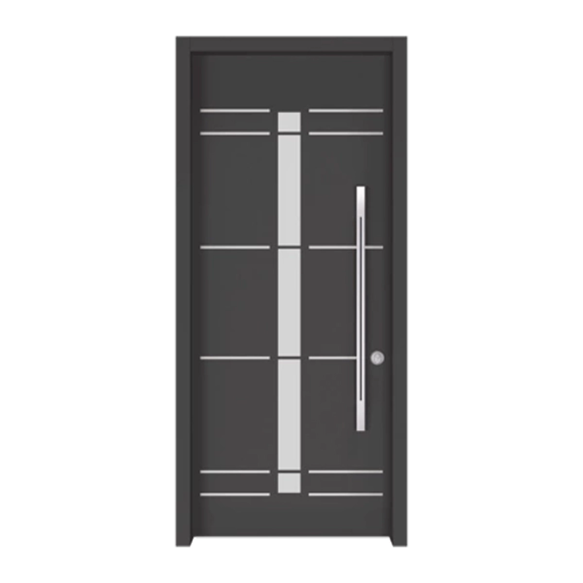 דלת כניסה דגם 2019 בעיצוב מודרני עם חלון אנכי מרכזי וקווים אופקיים דקורטיביים. הדלת משלבת עמידות גבוהה, בטיחות ומראה יוקרתי לבתים פרטיים.