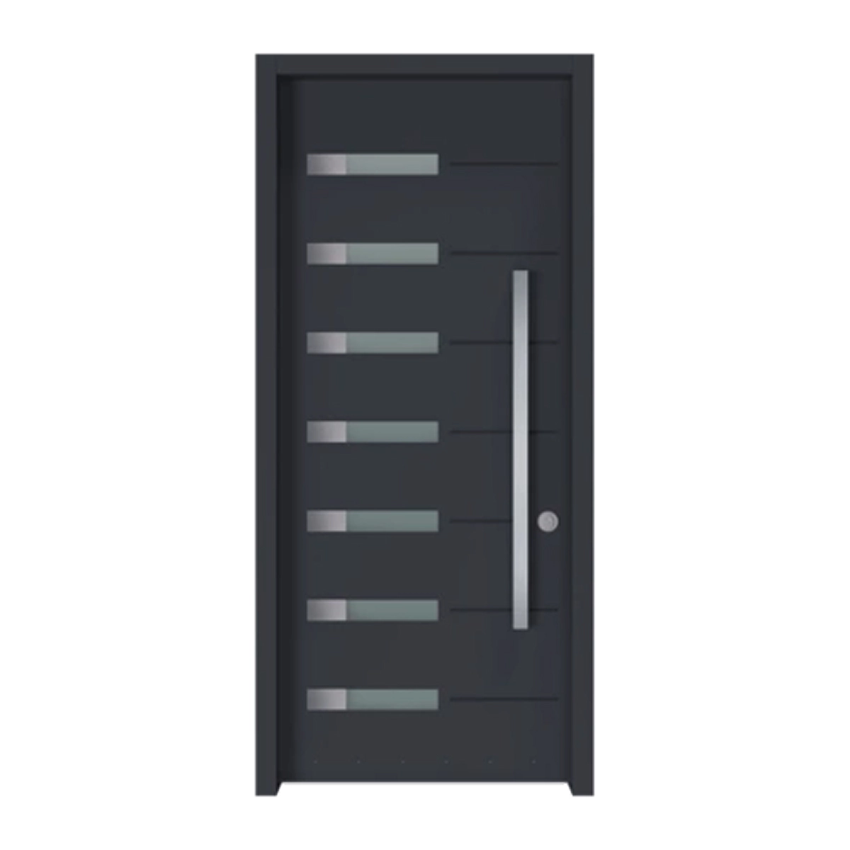 דלת כניסה דגם 7504 בעיצוב מודרני עם אלמנטים אופקיים וחלונות דקורטיביים. הדלת משלבת עמידות גבוהה, בטיחות ומראה יוקרתי לבתים פרטיים.