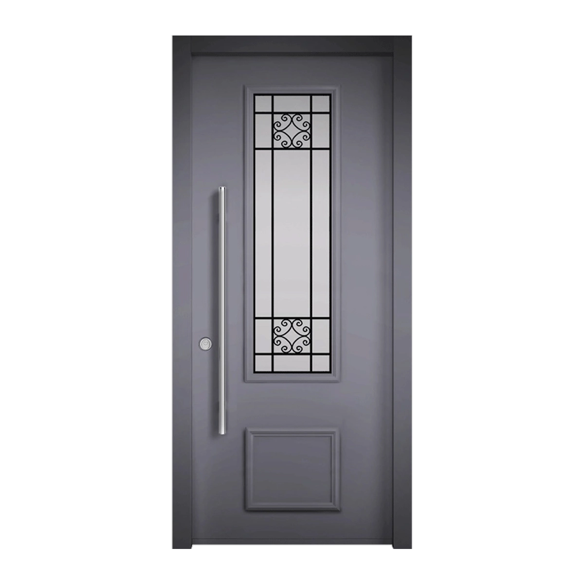 דלת כניסה דגם 5017 בעיצוב קלאסי עם חלון זכוכית דקורטיבי ואלמנטים מברזל. הדלת משלבת עמידות גבוהה, בטיחות ומראה אלגנטי לבתים פרטיים.
